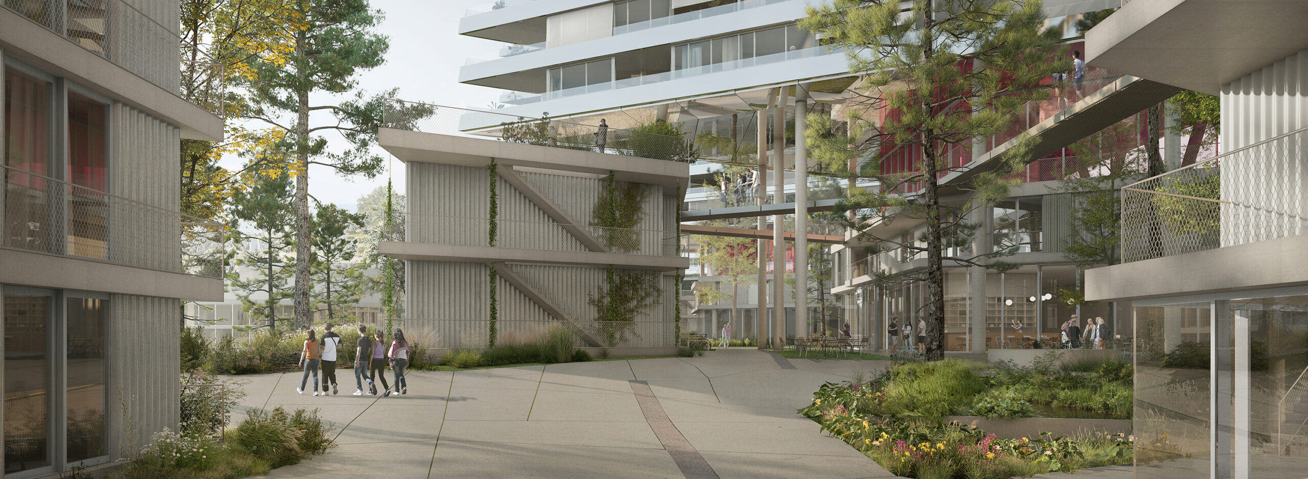 Grâce à une implantation judicieuse des 6 immeubles triangulaires s’articulant autour d’une rue principale, ce projet qui relie la forêt des Côtes de la Bourdonnette au nord et le parc du futur Campus Santé au sud, fait la part belle à la végétation. Près d’une centaine d’arbres seront choisis avec soin et plantés pour assurer une grande biodiversité et un lien harmonieux avec la forêt adjacente. Le quartier offrira également aux futur·e·s habitant·e·s des espaces communautaires, de jeux et de rencontres.